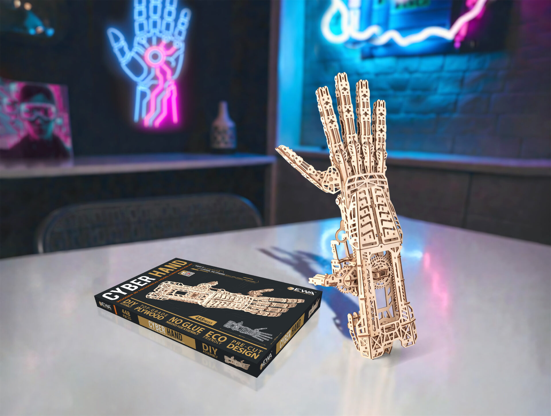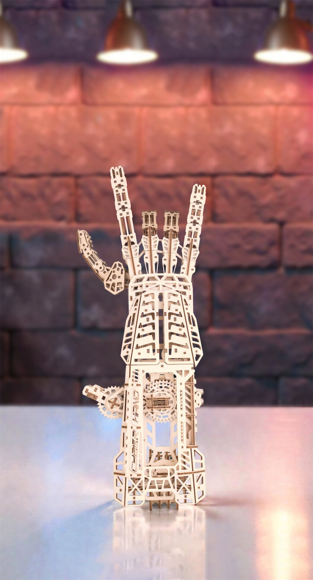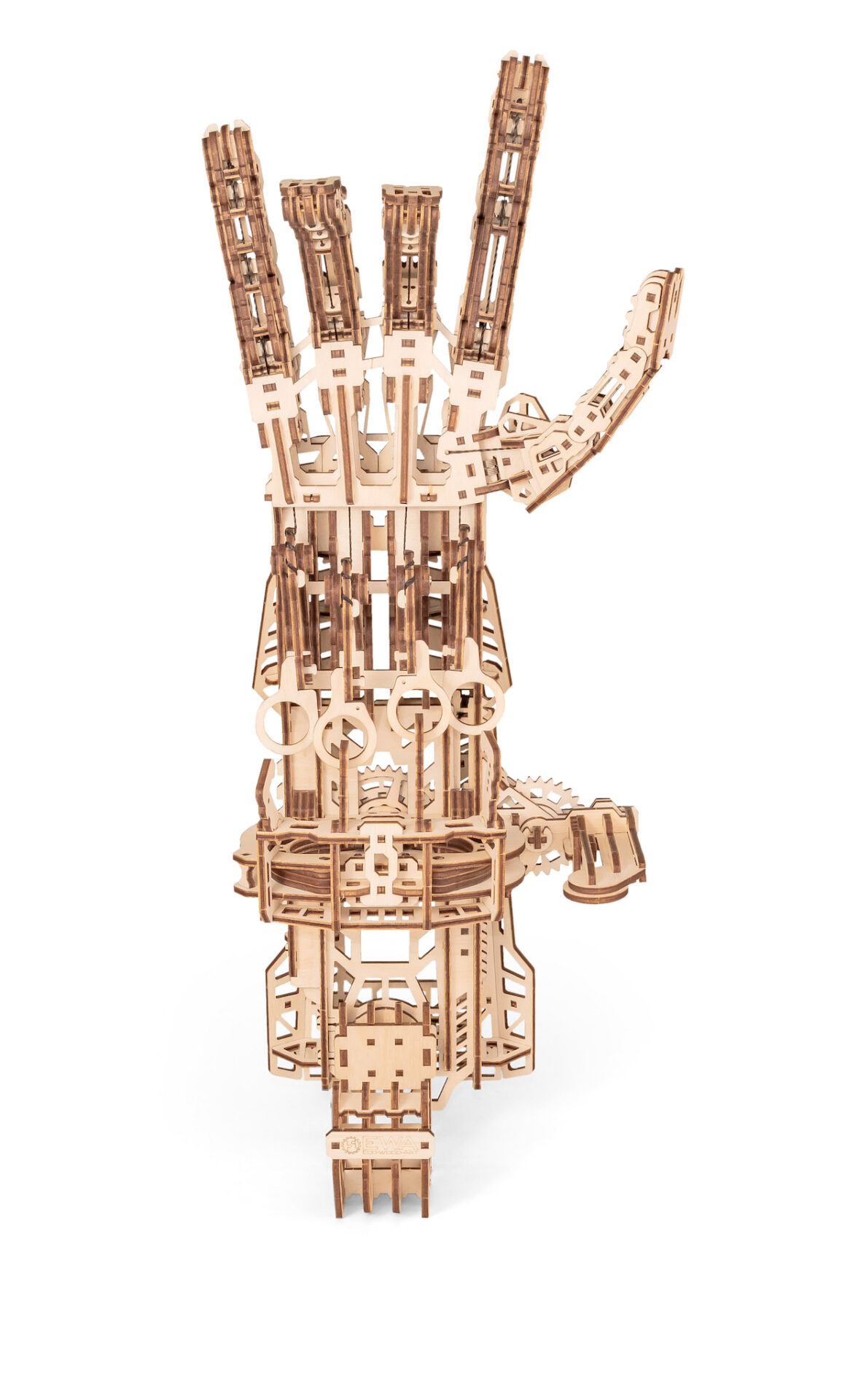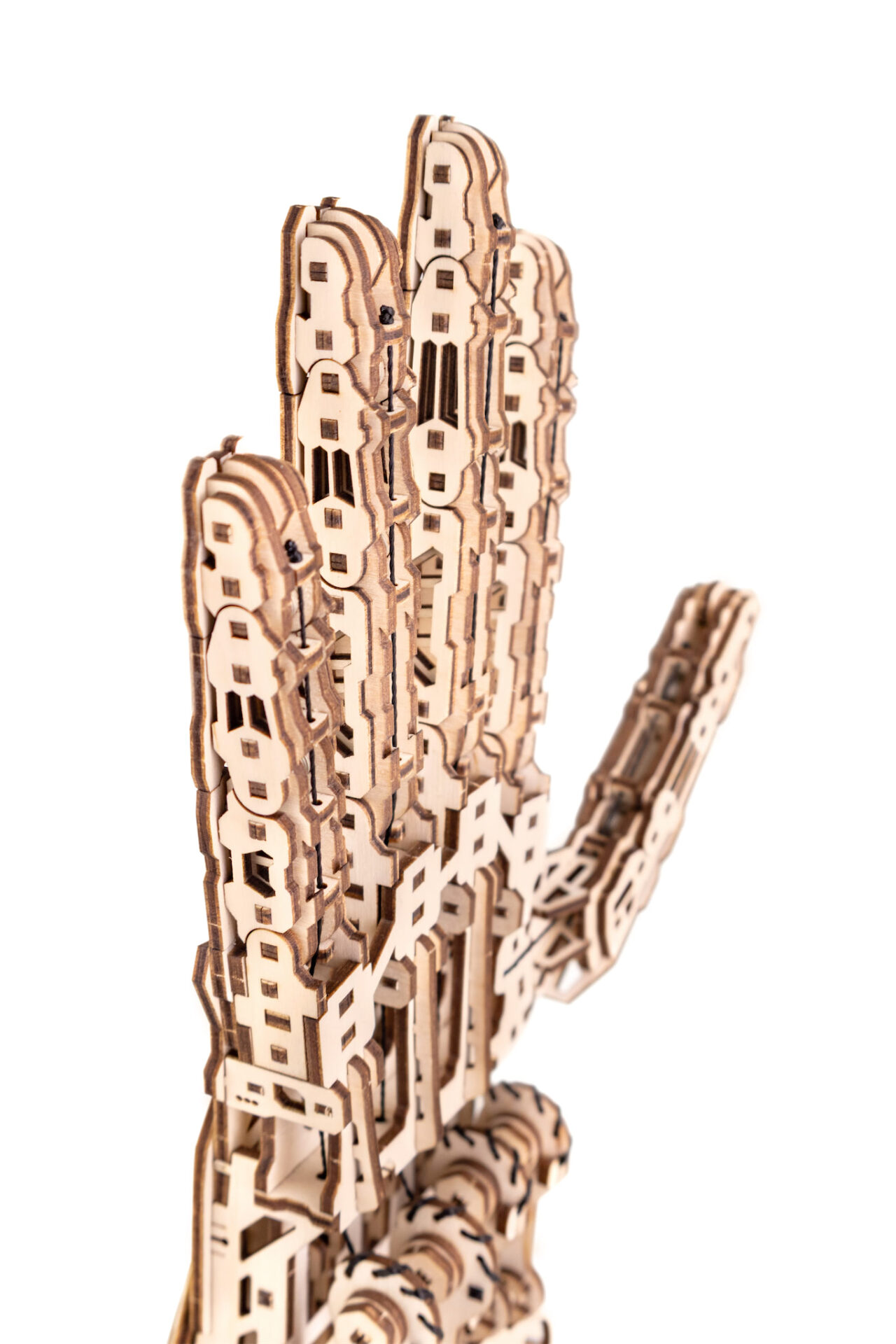Cyber Hand is a wooden mechanical construction kit for those who enjoy complex, well-engineered, and visually striking models. It is one of the most challenging builds in the collection, featuring 448 precisely fitted parts and metal springs inside that bring the mechanism to life.